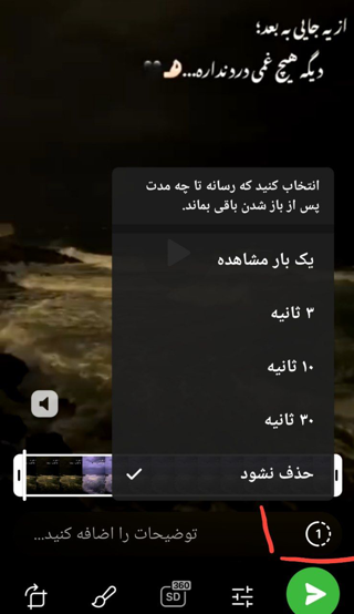 برای عکس وفیلم مدت دار هم میتونید از منو پایین صفحه استفاده کنید. قسمتی که زده توضیحات عدد 1رو نمایش داده..اونو بزنید ومدت ماندن عکس یافیلم رو تعیین کنید بعد بطور خودکار حذف میشه.