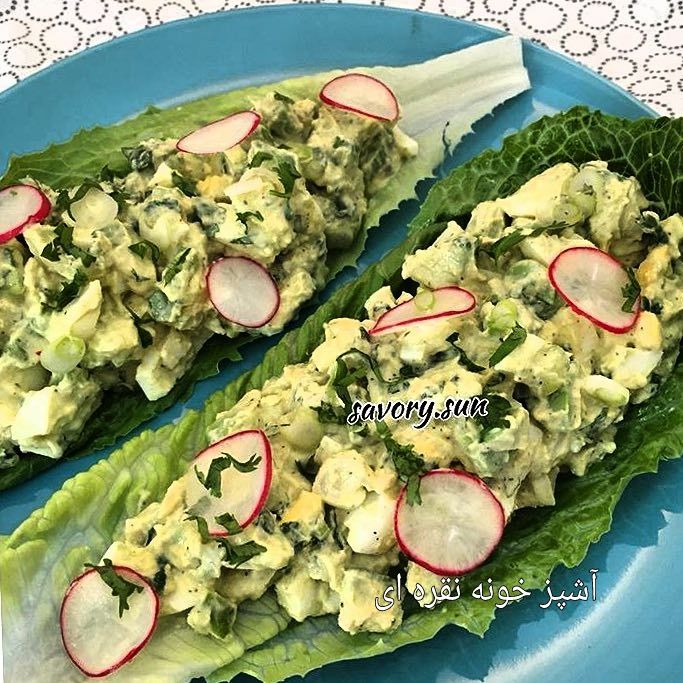 تخم مرغ اب پز ٣ سيب زمينى فلفل سبز تند گشنيز ريز شده ٣ ق غ پيازچه٣ مايونز ١-٢ق غ نمك، فلفل سياه و اب ليمو ترش به اندازه دلخواه همه مواد روبا هم مخلوط كنيد.