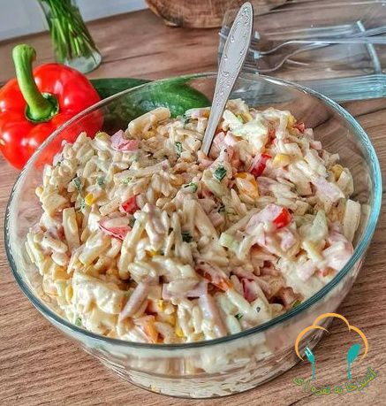 _پاستای پخته شده( مدل دانه برنجی ) ۳۰۰ گرم _ژامبون یا کالباس خرد شده یک پیمانه _خیارخرد شده یک پیمانه _ذرت پخته شده یک پیمانه _پنیر چدار نصف پیمانه _فلفل دلمه ای قرمز یک عدد _پیازچه خرد شده نصف پیمانه مواد سس: _ماست نصف لیوان _سس مایونز