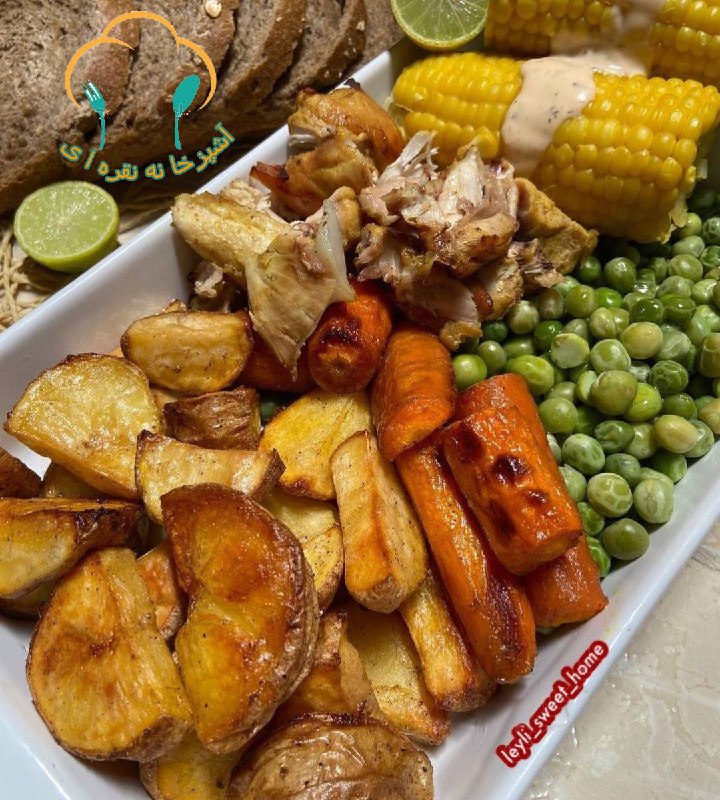 سیب زمینی ها رو خوب شسته و برش میزنیم ، بهشون روغن زیتون و ادویه دلخواه میزنیم و روی کاغذ روغنی سینی فر میچینیم . هویج ها رو هم شسته ، برش میزنیم و کنار سیب زمینی ها میچینیم . حدود ۵۰ دقیقه توی فر گرم شده با دمای ۱۸۰ د