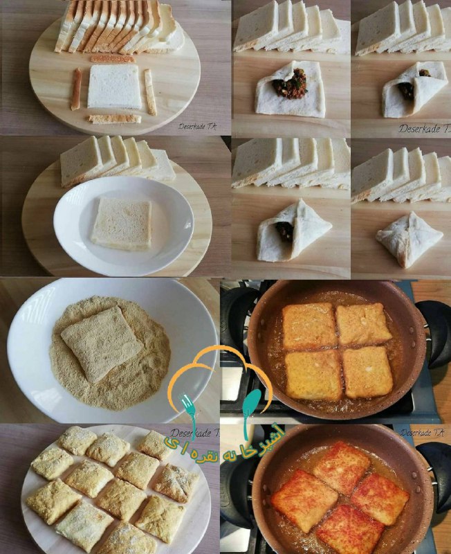 ابتدا اطراف نون های تست رو جدا میکنیم، سپس هر برش نون رو داخل ظرف آبی فرو میکنیم تا نرم شوند و به آرومی کف دست گذاشته فشار میدهیم تا آب اضافشون خارج بشه، حالا مواد میانی که به دلخواه آماده کردیم رو وسط نون قرار میدیم و کمی پنیر پیتزا