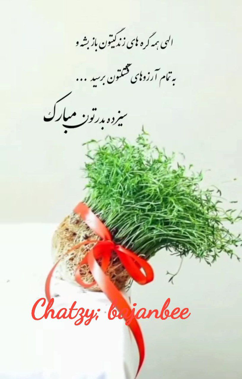 🌸الهی سیزده بدر ، سال دگر 🌿هیچ کس نباشد در به در 🌸از عشق و مهر و عاطفه 🌿قلبی نباشد بی اثر 🌸خاموش و سرد و ناامید 🌿هرگز نباشد یک نفر 🌸هرگز نیفتد یک درخت 🌿از ضربه ی سرد تبر 🌸از جنگ و خونریزی ، زمین 🌿خالی بماند سر به سر 🌸هرگز