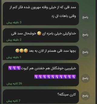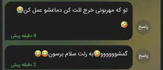 2«🤣🤣اره خوشحال ممد قلی می‌دونم خوشحال هروقت فهمیدم چی میگی جوابتو میدم 😂😂😂😂😂 تو درست میگی