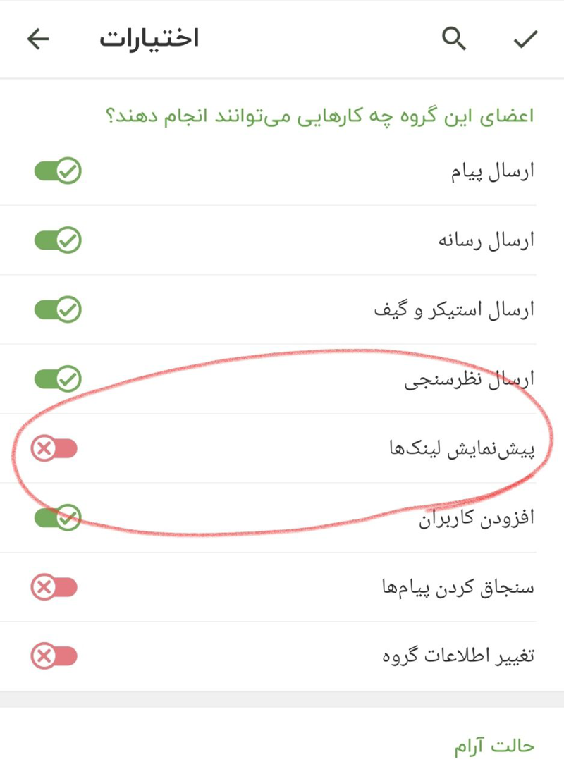 برای جلوگیری از امکان ارسال لینک توسط اعضا گروه کافیه در بخش تنظیمات گروه روی گزینه اختیارات بزنید و سپس گزینه پیشنمایش لینک رو غیر فعال کنید. به همین سادگی دیگر اعضا امکان ارسال لینک توی گپ شما را نخواهند دا