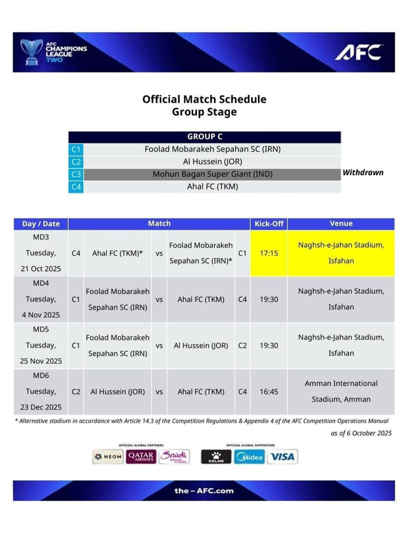 🔹تیم فوتبال سپاهان ایران طبق برنامه کنفدراسیون فوتبال آسیا (AFC) در چارچوب دور سوم از مرحله گروهی لیگ آسیا ٢٠٢٦، هر دو دیدار رفت و برگشت برابر آخال ترکمنستان را در ورزشگاه نقش جهان اصفهان برگزار خواهد شد.