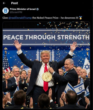 ♦️تصویری که اکانت رسمی نخستوزیری با تصویر نتانیاهو و ترامپ به این ترتیب منتشر کرده و خواهان اهداء جایزه صلح نوبل به ترامپ شده است