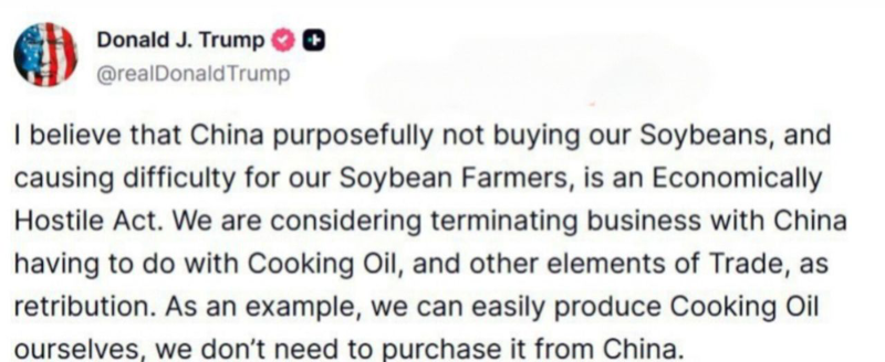 رئیسجمهور آمریکا، در واکنش به کاهش واردات سویا از سوی چین، این اقدام را «خصمانه از نظر اقتصادی» توصیف کرد و گفت: 🔹️معتقدم چین عمداً از خرید سویای ما خودداری می