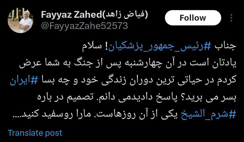 🔺فیاض زاهد: آقای پزشکیان تصمیم درباره شرم الشیخ یکی از آن روزهاست! مارا روسفید کنید