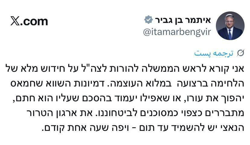 ⭕️بن گویر: من از نخست وزیر میخواهم که به ارتش دستور دهد تا با تمام قوا نبرد در نوار غزه را از سر بگیرد