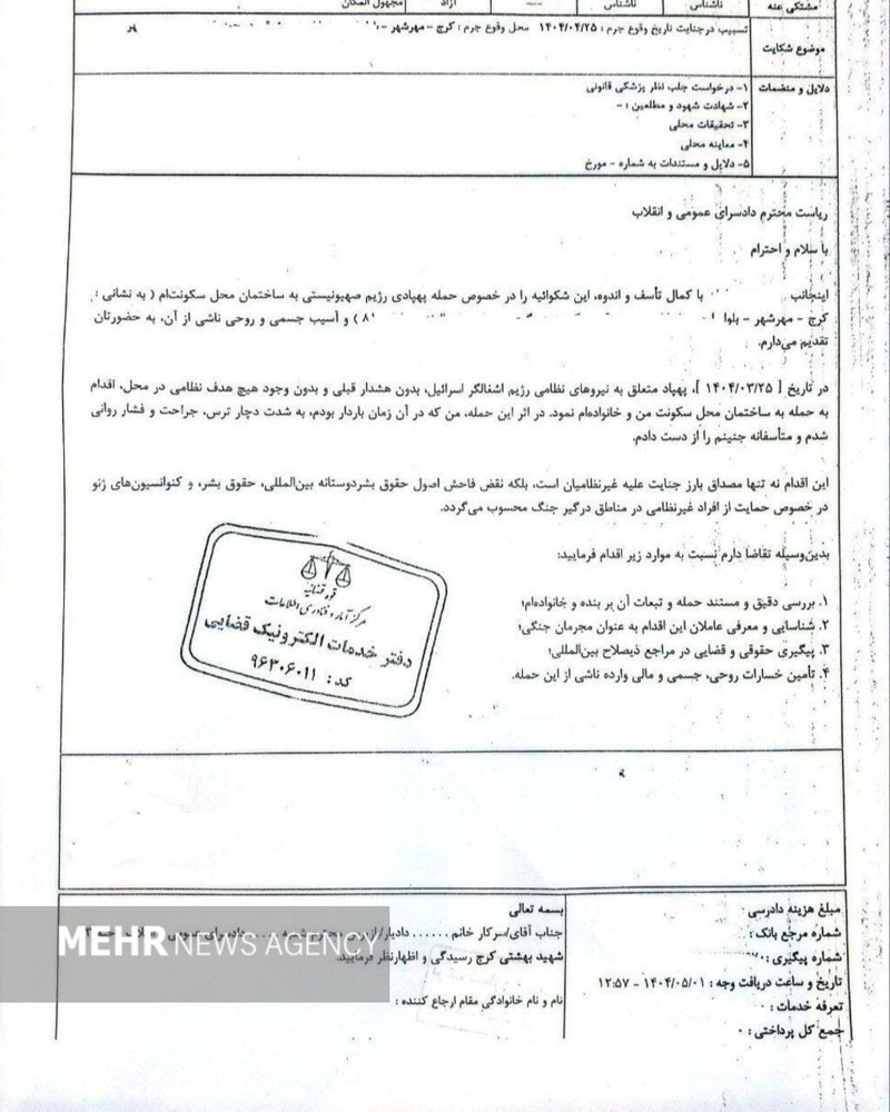 🔹 یک زن باردار ساکن مهرشهر کرج با حضور در دادسرای عمومی و انقلاب کرج، از اسرائیل به دلیل «ایجاد رعب و وحشت عمومی» و «سقطجنین ناشی از حمله پهپادی جنگ تحمیلی» شکایت کرد.