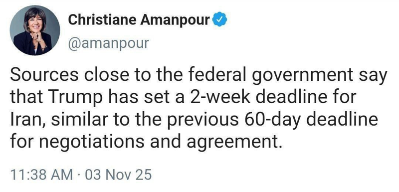 🔹براساس بررسیها، پیامی که در فضای مجازی مبنی بر ضربالاجل دو هفتهای ترامپ برای ایران به نقل از کریستین امانپور، مجری سیانان، منتشر شده است، وجود خارجی ندارد./فارس