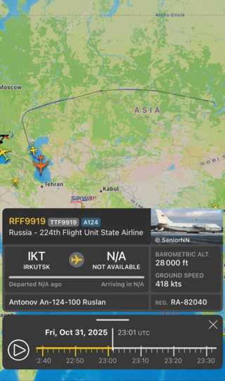 🚨🇮🇷🇷🇺هواپیمای باری سنگین نظامی روسی (An-124) از مبدا ایرکوتسک در مسیر ایران است.