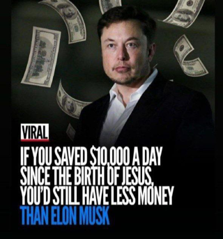 ♦️میزان ثروت ایلان ماسک: اگر فردی از روز تولد عیسی مسیح، روزانه ۱۰ هزار دلار پسانداز میکرد همچنان ثروت او کمتر از ایلان ماسک میشد! شما بودین پس انداز میکردین؟ آره 👍🏻 نه 👎🏻