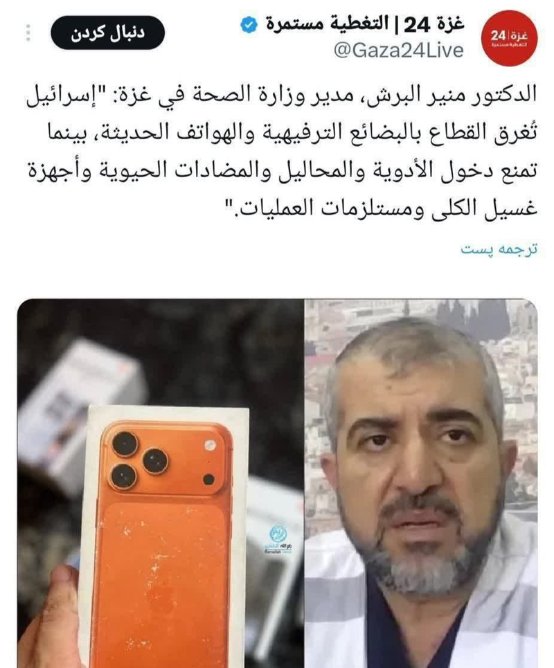 درباره همین ببینید مدیر وزارت بهداشت غزه چی میگه: اسرائیل این منطقه را با کالاهای لوکس و موبایل های مدرن اشباع کرده، درحالی که از ورود دارو، محلول های آنتی بیوتیک، دستگاه دیال