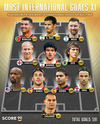 🔺 حضور علی دایی و کریم باقری در تیم منتخب اسطوره های تاریخ فوتبال بر اساس بیشترین گل ملی