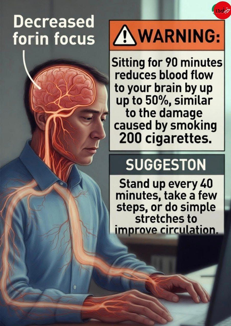 فرزینمهر، متخصص پزشکی ورزشی: 🔸تنها ۹۰ دقیقه نشستن بدون حرکت باعث کاهش خونرسانی به مغز و افت تمرکز میشود. 🔸بیتحرکی میتواند روزانه بهاندازهٔ مصرف ۲۰۰ نخ سیگار به بدن آسیب بزند. 🔸به افراد شاغل