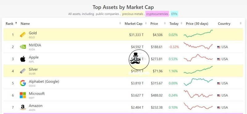 نقره که اخیرا از مایکروسافت و گوگل سبقت گرفته، با عبور از قیمت ۷۲ دلار در هر اونس، امروز توانست از اپل نیز عبور کند و درجایگاه سوم بزرگترین دارایی های دنیا از لحاظ ارزش بازار قرار گیرد.