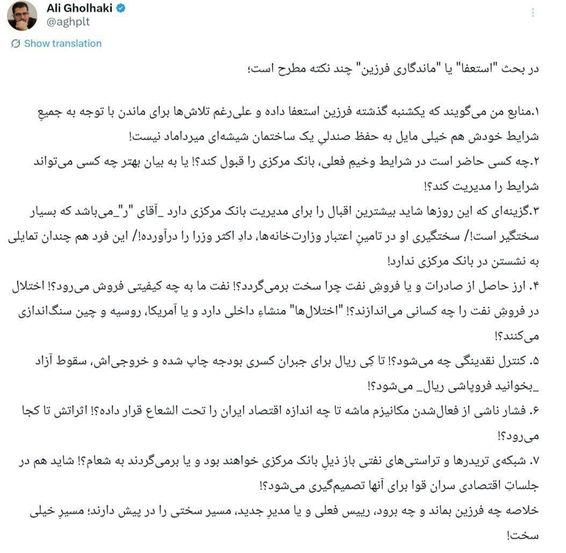 🔻ادعای علی قلهکی: فرزین یکشنبه گذشته استعفا کرده!/ خودش هم دیگر تمایل به ماندن ندارد/ آقای "ر" که سختگیری بالایی در مسائل مالی دارد گزینه جایگزین فرزین است که تاکنون راضی نشده!