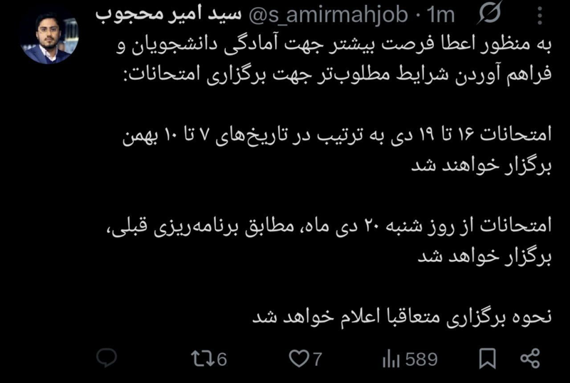 فوری/مدیر روابط عمومی کل دانشگاه آزاد اعلام کرد، به منظور اعطای فرصت بیشتر جهت آمادگی برای شرکت در امتحانات: امتحانات روزهای ۱۶ تا ۱۹ دیماه به ترتیب در تاریخهای ۷ تا ۱۰ بهمن ماه برگزار خواهد شد. امتحانات از روز شنبه ۲۰ دی ماه، مطابق برنامهریزی