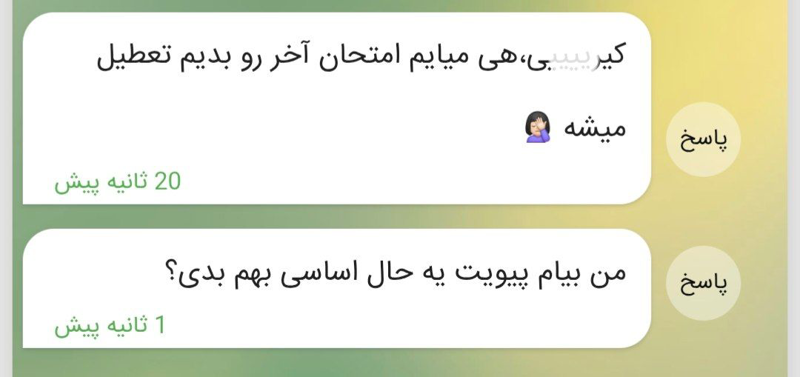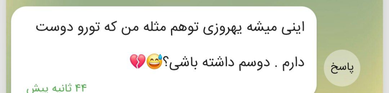 ن متاسفانه دارم با یکی آشنا میشم نمیدونم گفتیم دو هفته فقط آشنایی ببینیم تهش میتونیم باهم بسازیم یانه پس از الکی نگو چون دلت میشکنه