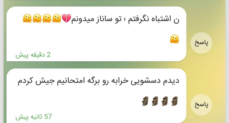 2.وایییی🤣🤣🤣🤣 خب بزار بگم ایشون آخرین زنگ هفته با ما داره یکی از سوتی هاش اینه از زنگ اول تا زنگ آخر مقنعه رو برعکس پوشیده بود🤣🤣🤣🤣🤣🤣🤣🤣🤣🤣