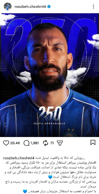 پست روزبه چشمی به مناسبت ۲۵۰امین بازیش با پیراهن استقلال