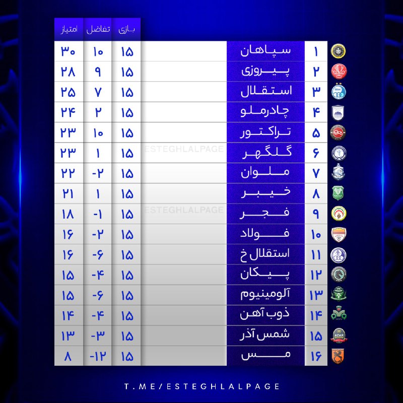 جدول لیگ پس از برد استقلال مقابل سپاهان