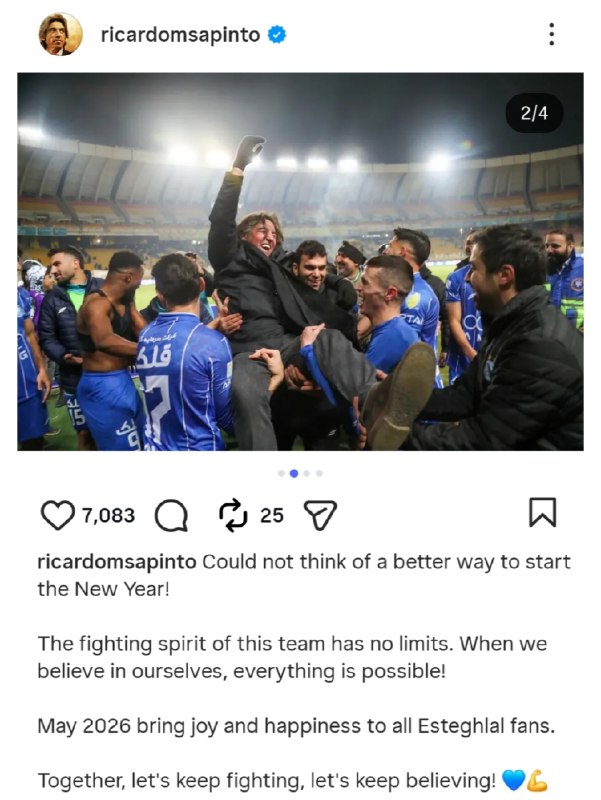 ریکاردو ساپینتو: روحیه جنگندگی این تیم حد و مرزی ندارد. وقتی به خودمان ایمان داشته باشیم، همه‌چیز ممکن است/ امیدوارم سال ۲۰۲۶ برای همه هواداران استقلال پر از شادی و خوشبختی باشد/ با هم، به جنگیدن ادامه می‌دهیم و به باور داشتن ادامه می‌دهیم.