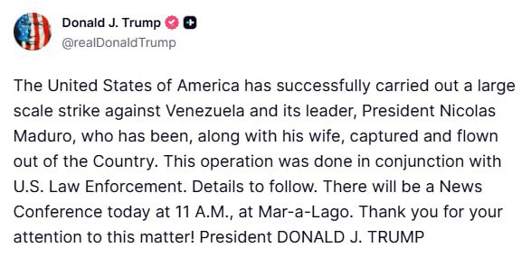 🚨ترامپ: مادورو رئیس جمهور ونزوئلا توسط نیروهای آمریکایی دستگیر شد.