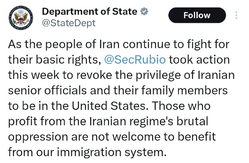 وزارت امورخارجه آمریکا: فرزندان و اعضای خانواده مقامات ایرانی را از آمریکا اخراج خواهیم کرد