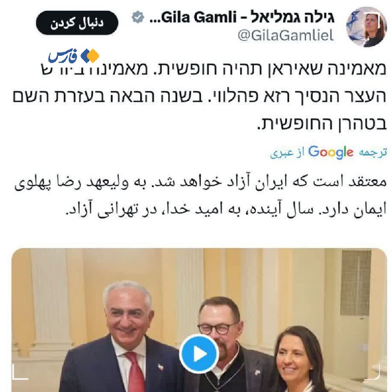 🔹گیلا گاملیل، وزیر سابق اطلاعات رژیمصهیونی و وزیر فعلی فناوری این رژیم جعلی در توییتی با انتشار تصویر رضا پهلوی کنار خود نوشت: معتقدم که ایران آزاد خواهد شد، به ولیعهدی رضا پهلوی ایمان دا