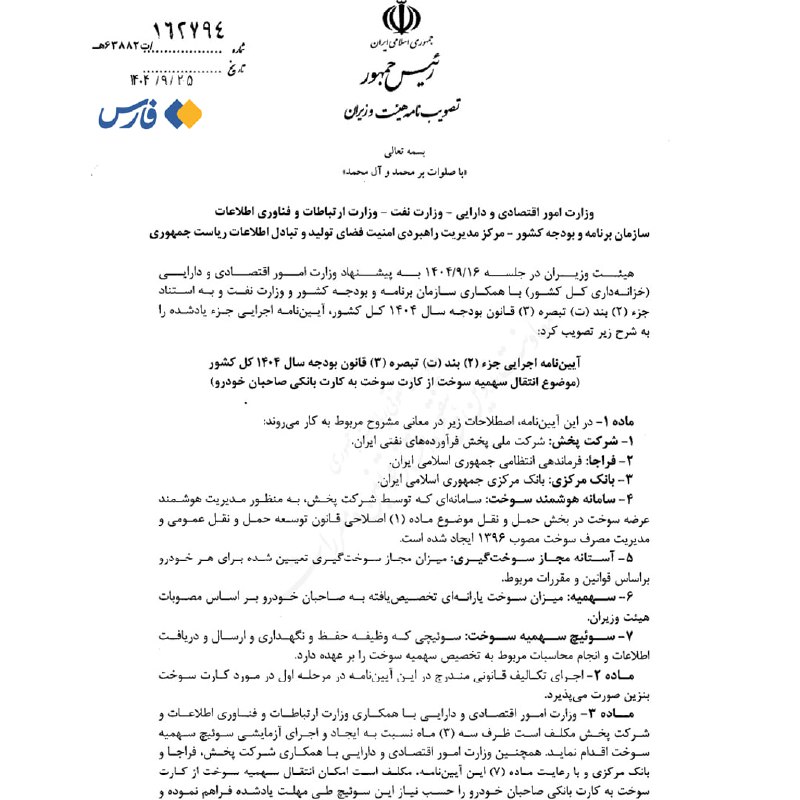 🔹معاون اول رئیس‌جمهور آیین‌نامه اجرایی انتقال سهمیه بنزین از کارت سوخت به کارت بانکی مالکان خودرو را ابلاغ کرد.