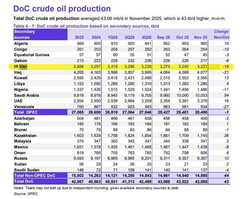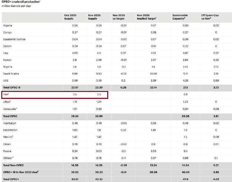 🔹آخرین گزارش آژانس بینالمللی انرژی نشان میدهد که ایران در ماه نوامبر (آبانماه) روزانه ۳.۵ میلیون بشکه نفت تولید کرده که نسبت به ماه پیش از آن یعنی اکتبر تغییری نداشته است.