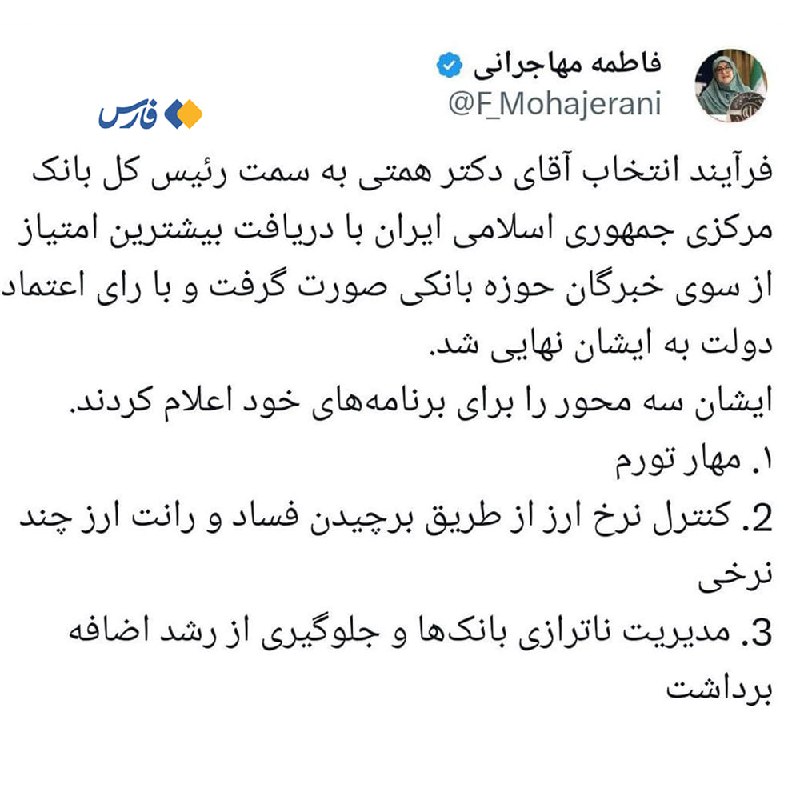 🔹همتی: هدف اصلی من ایجاد ثبات اقتصادی است و این کار را خواهم کرد و من این قول را به مردم عزیز میدهم که ثبات اقتصادی را در جامعه فراهم بکنیم.