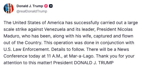 ترامپ مدعی شد آمریکا مادورو و همسرش را در ونزوئلا دستگیر و از کشور خارج کرده‌ است.
