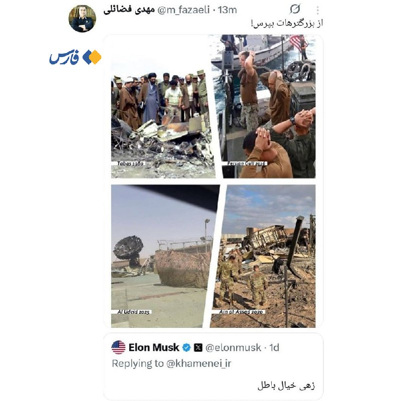 🔹عضو دفتر حفظ و نشر آثار رهبر انقلاب در واکنش به توییت ایلان ماسک، با انتشار ۴ تصویر تاریخی (طوفان طبس ۱۹۸۰ - توقف و بازداشت قایق آمریکایی در خلیج فارس ۲۰۱۶ - حملۀ موشکی سپاه به پایگاه آمریکایی عینالاسد در