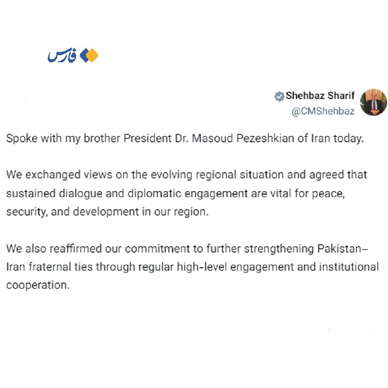 🖼 نخستوزیر پاکستان: امروز با برادرم، مسعود پزشکیان صحبت کردم