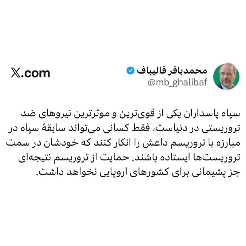 🖼 قالیباف: فقط کسانی سابقۀ مبارزۀ سپاه علیه داعش را انکار می‌کنند که در سمت تروریست‌ها ایستاده‌اند