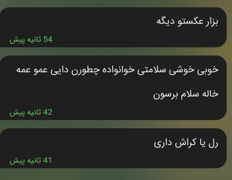 خوبم خوشم سلامتم خانواده خوبن دایی عمو عمه خوبن خاله ندارم 😂