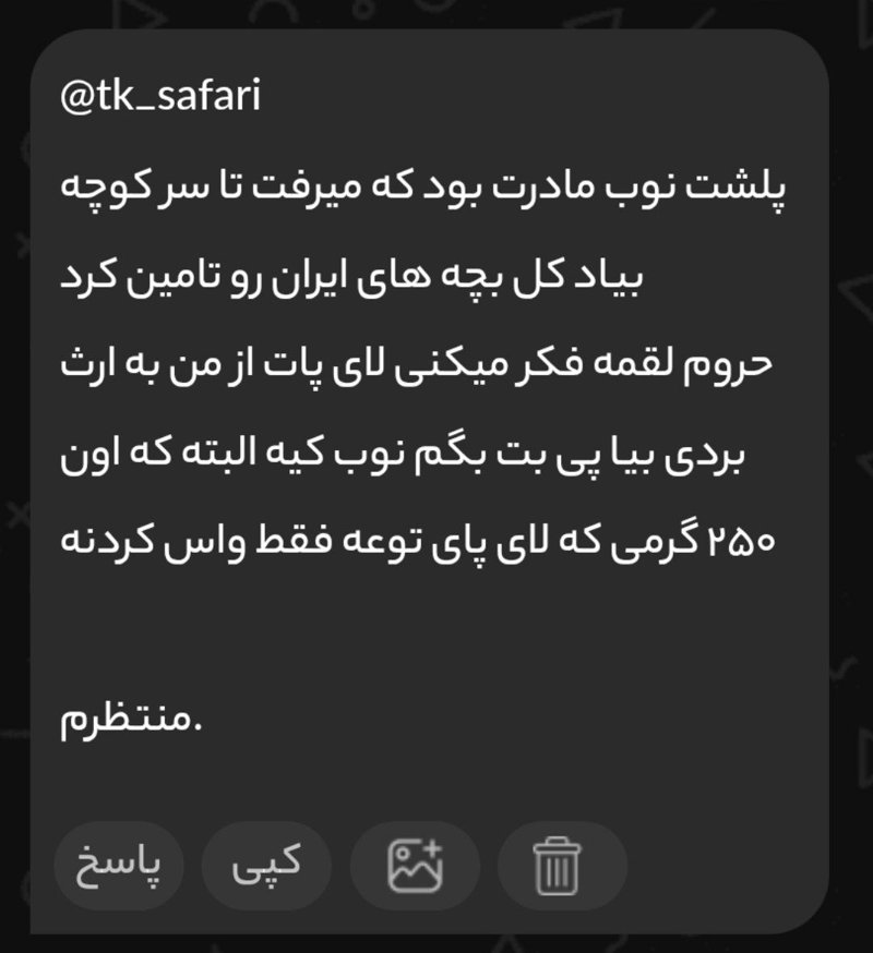 2- خب الان من قبول کنم جندم چی به تو میرسه؟ 🤣🤌🥰کصت اتوبان نیس که هست . مادرت جنده نیس که هست 🗿😂