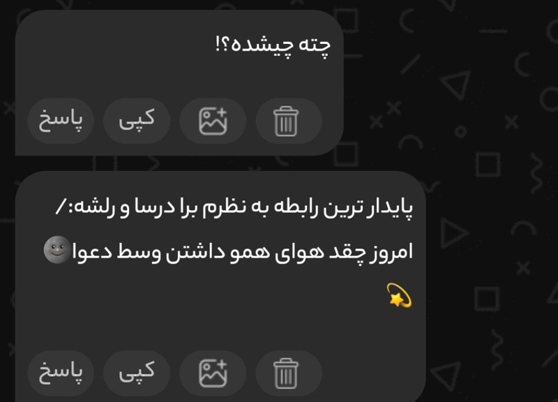 6نمیدونم ی روز صب بام سرد شد هرچیم تکس دادم ج نداد بعد چت پاکید رفت هنوزم نمیدونم