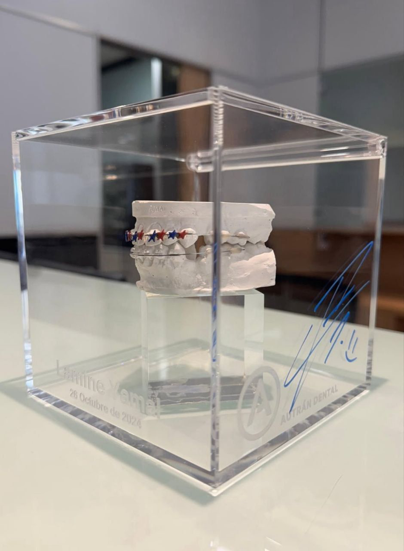 یامال از ارتودنسیهایی ک تو الکلاسیکو استفاده میکرد رو، امضا کرد و هدیه داد به همون کلينيکی که اینو براش ساخته بودن.