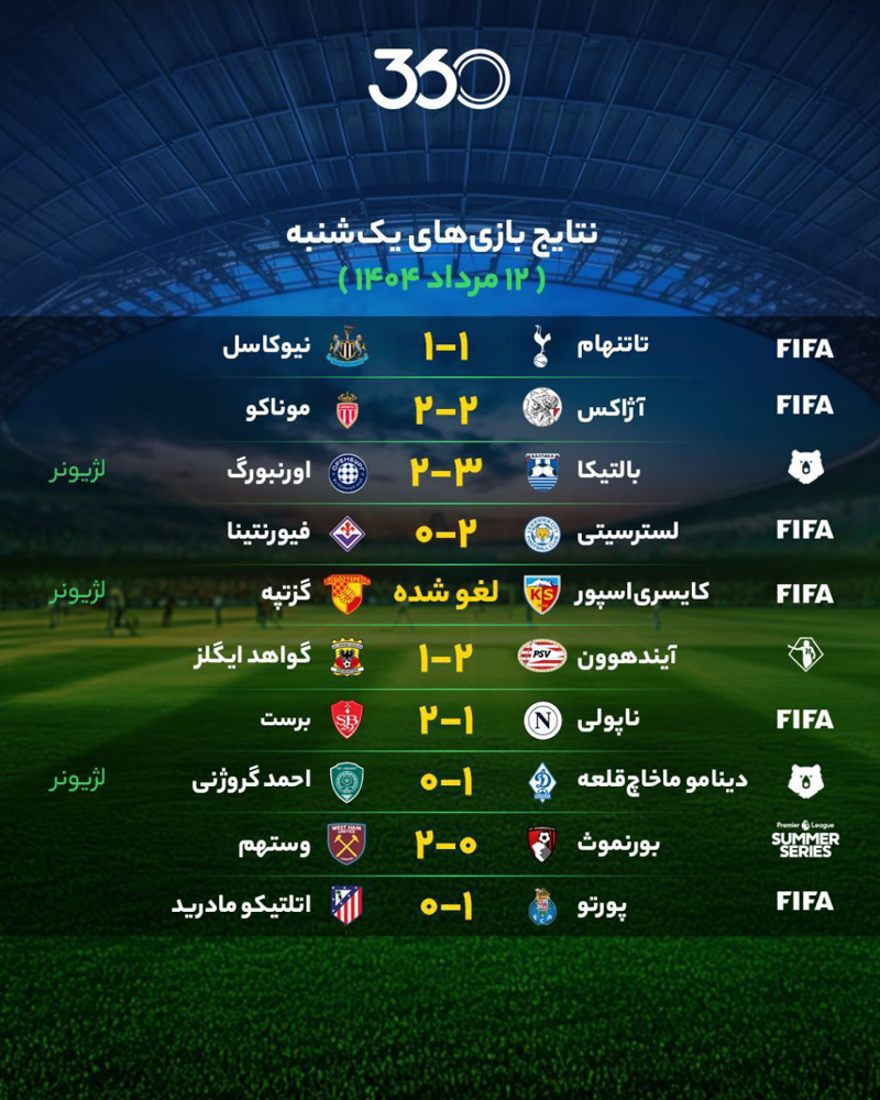 📝 نتایج مهمترین بازیهای دوشنبه ۱۳ مرداد