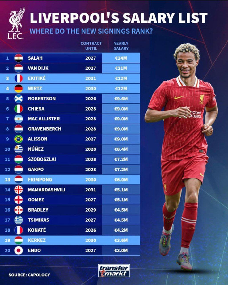 📊 بیشترین دستمزد بین بازیکنان لیورپول.