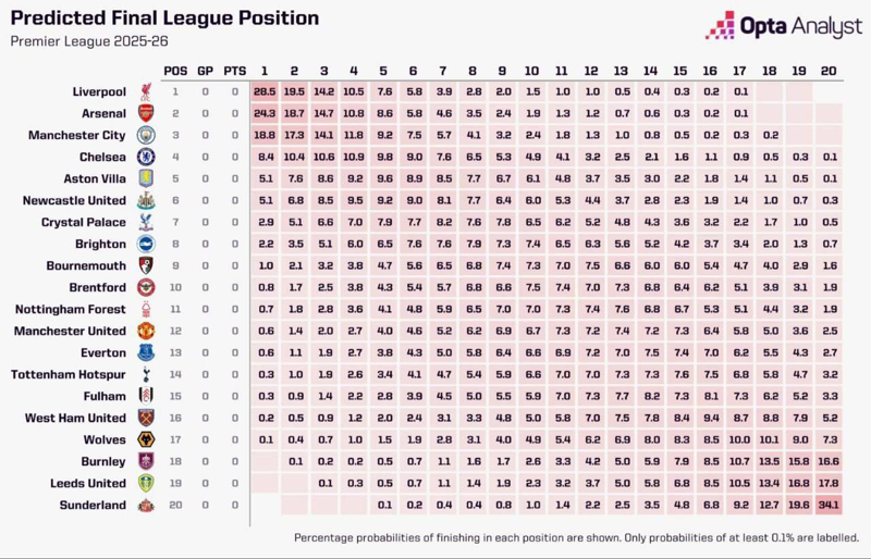 🔸 لیورپول با ۲۸/۵، آرسنال با ۲۴/۳ و منچسترسیتی با ۲۴/۳ درصد، شانس‌های اصلی قهرمانی لیگ برتر فصل جدید هستند.