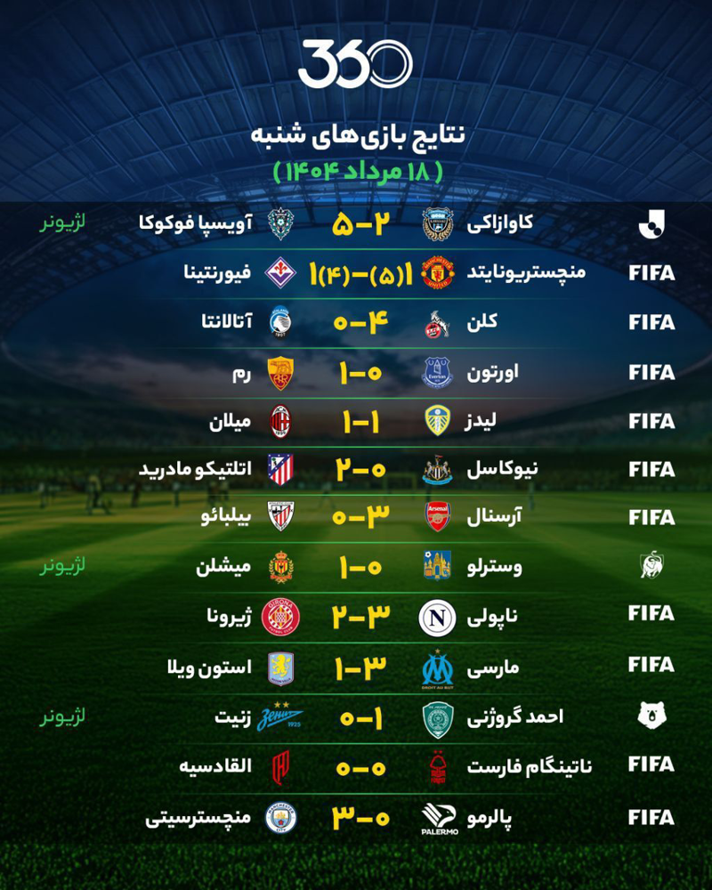 🔺نتایج مهمترین بازیهای شنبه ۱۸ مرداد