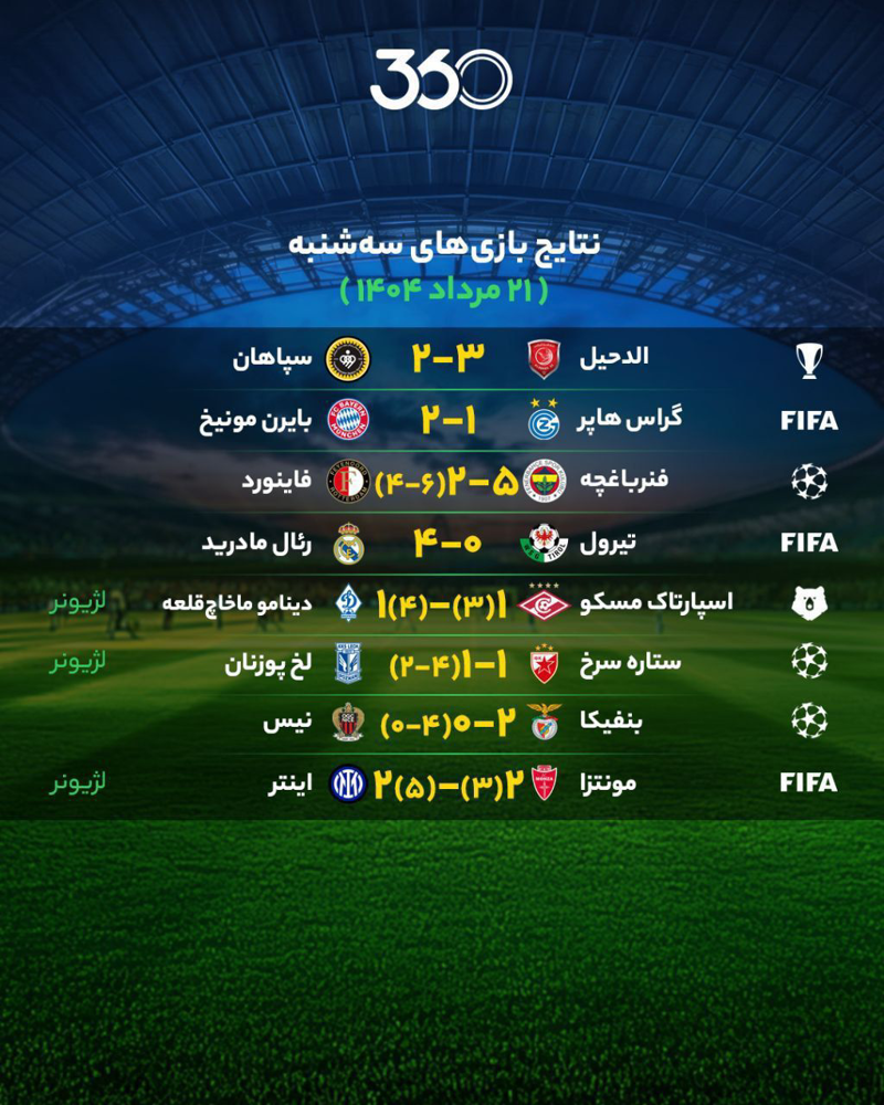 🔺نتایج مهم‌ترین بازی‌‌‌‌های سه‌شنبه ۲۱ مرداد