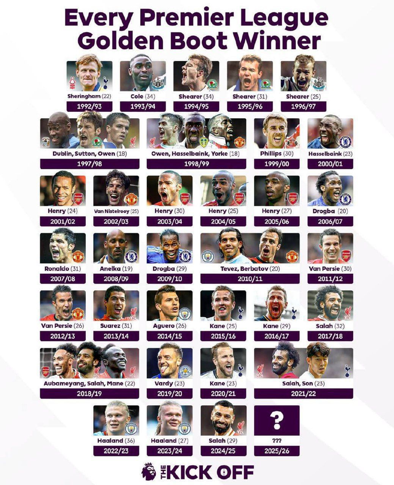 🔺برندگان کفش طلای لیگ برتر انگلیس از فصل ١٩٩٢/٩٣.