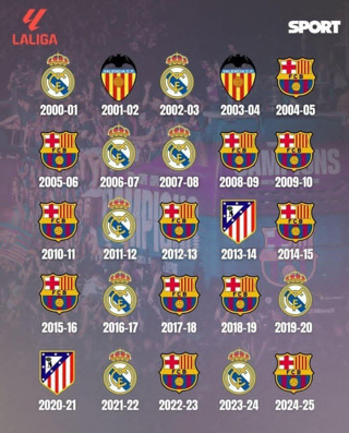 🔺به بهانه شروع فصل جدید لالیگا؛ قهرمانان لیگ اسپانیا از فصل ۲۰۰۰/۰۱.