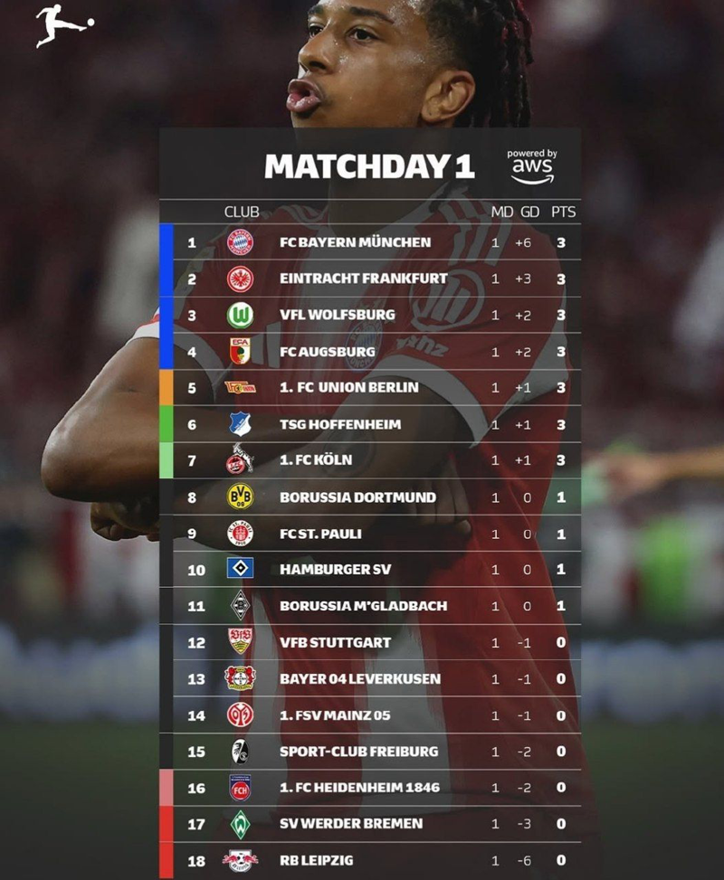 📊 جدول بوندسلیگا در پایان دیدار های هفته اول.